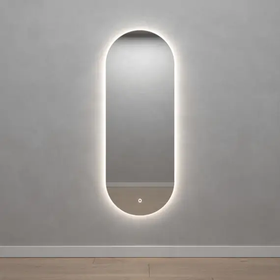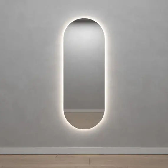 Безрамное зеркало овальной (капсульной) формы с контурной (тыльной) холодной подсветкой, свет 6000К. Подложка из высококачественного МДФ, светодиодная лента защищена матовым свето-рассеивателем от попадания пыли и влаги. Есть вывод 220W для подключения к сети, включение подсветки от выключателя на стене, либо от розетки.
