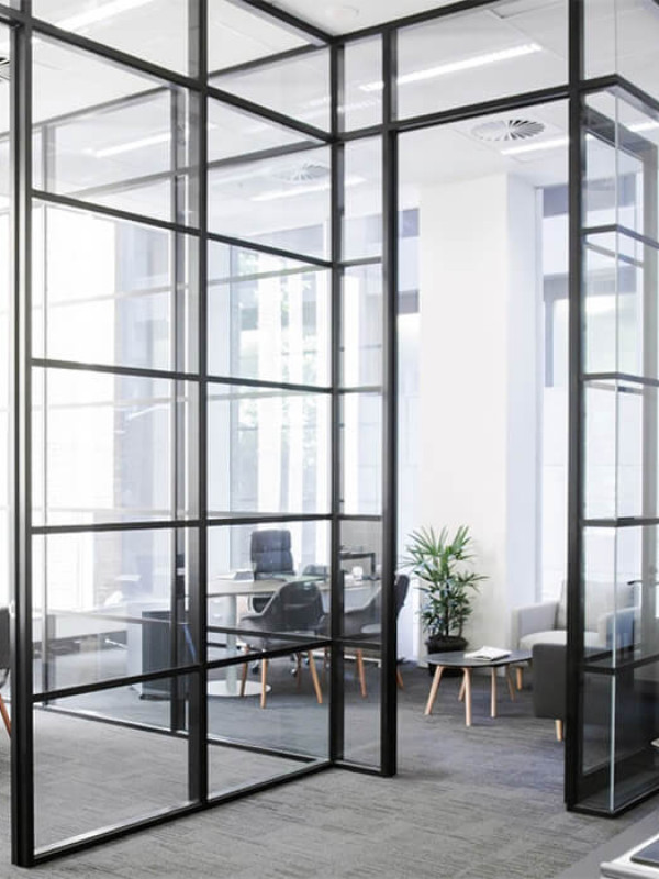 Стильно смотрится прямоугольная перегородка, разделенная на одинаковые квадратные блоки, внутри которых надежно зафиксировано закаленное многослойное стекло – триплекс.
